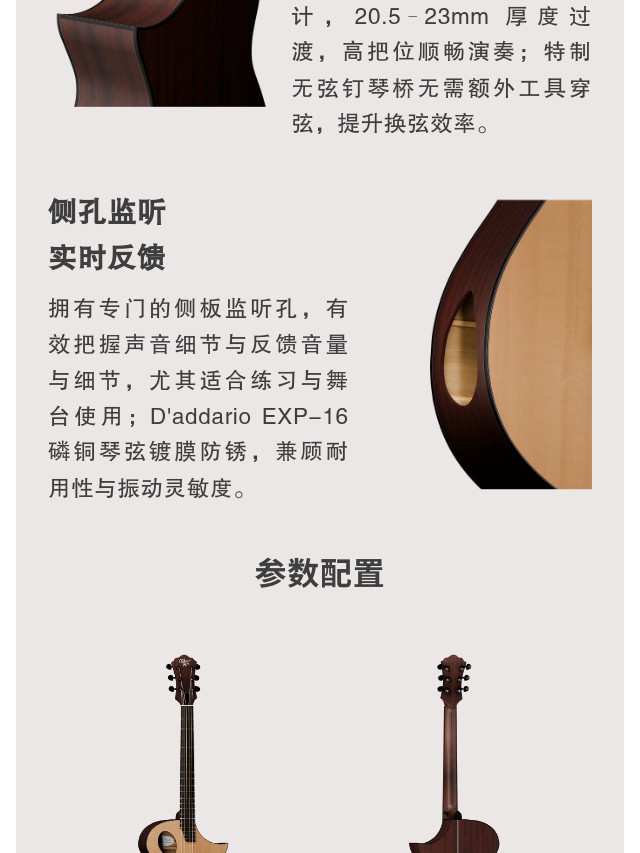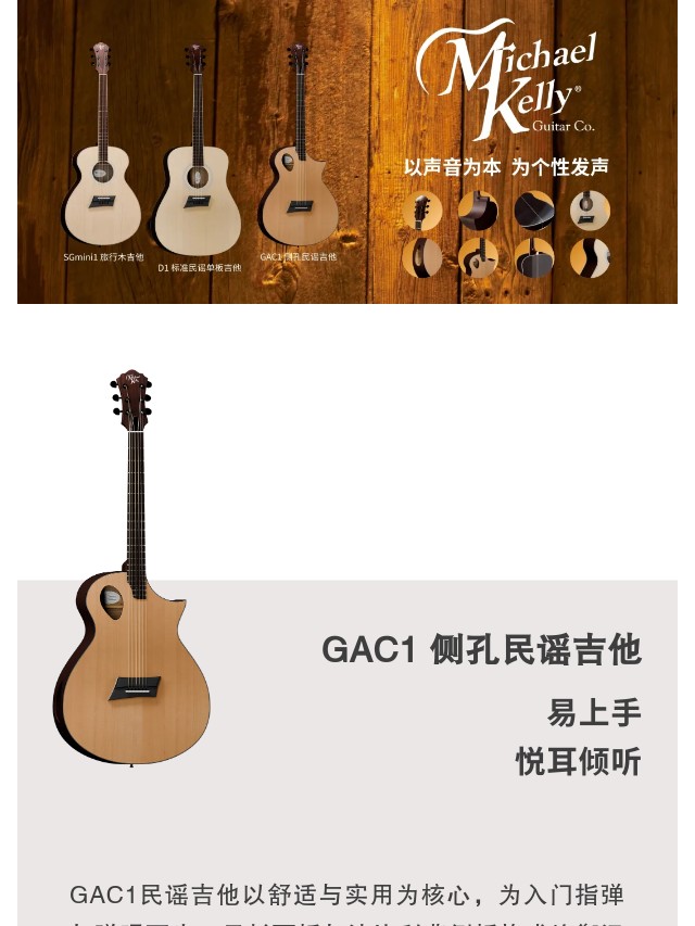 GAC1民谣吉他以舒适与实用为核心,为入门指弹与弹唱而生。云杉面板与沙比利背侧板构成均衡温暖的音色基础,25.5 英寸标准弦长提供宽广均衡音域。侧板监听孔即时捕捉声音细节,Comfort C 型渐进琴颈带来顺滑的指弹演奏体验。无弦钉玫瑰木琴桥、双向调节钢筋与耐磨镍银品丝确保长期稳定与耐用。GAC1 以简洁设计与人性化细节,让初学者更快进入音乐世界,倾听心灵之声。