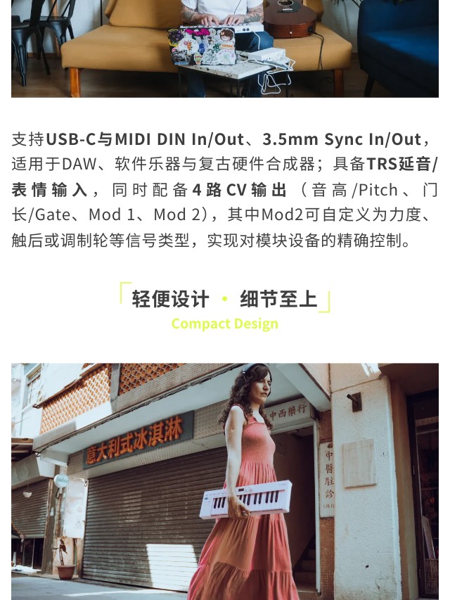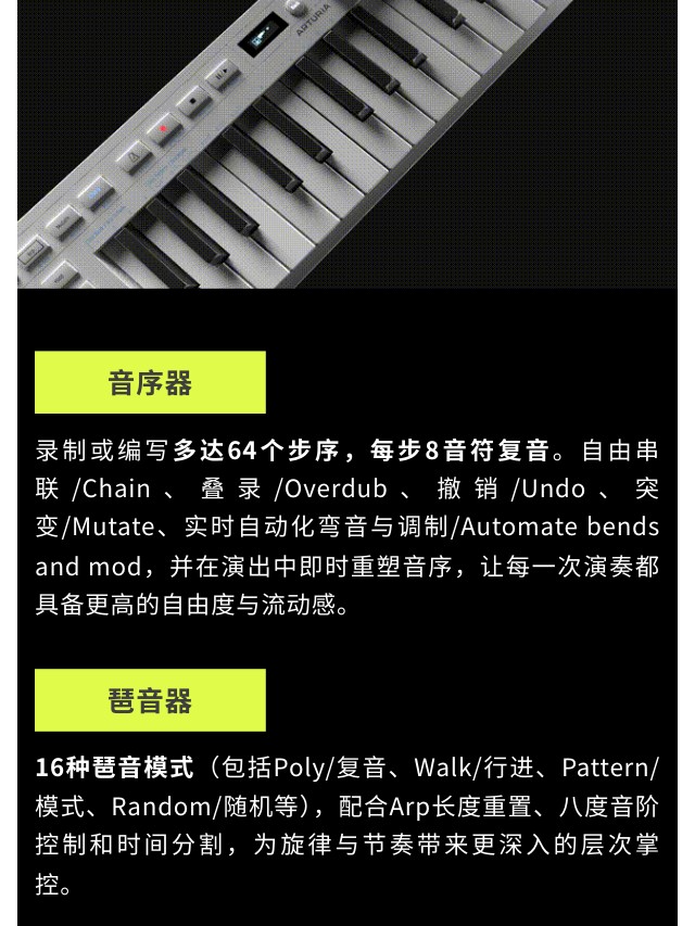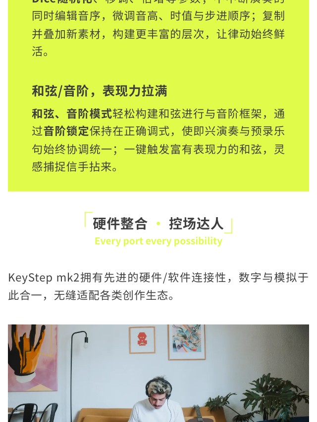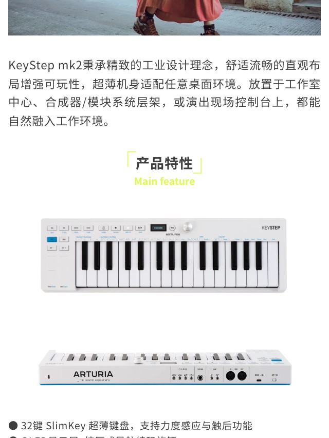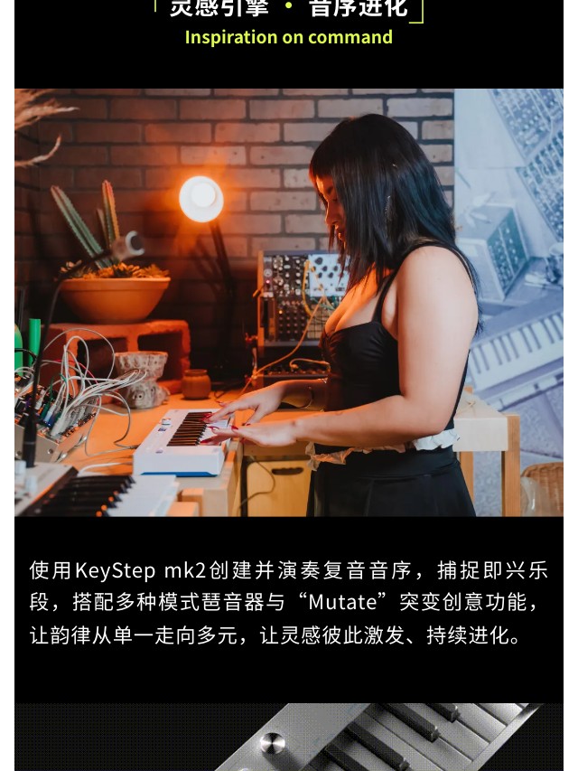 KeyStep mk2 是集演奏、音序与控制于一体的创意核心。32键带触后的Slimkey键盘兼顾细腻触感,多达64步音符的复音步进音序器与16种琶音模式,为旋律创作注入无穷变化;无论是现场表演、模块合成器控制,还是直连DAW制作,KeyStep mk2都以即时连接性和流畅演奏体验,成为你掌控创作全局的灵感中枢。