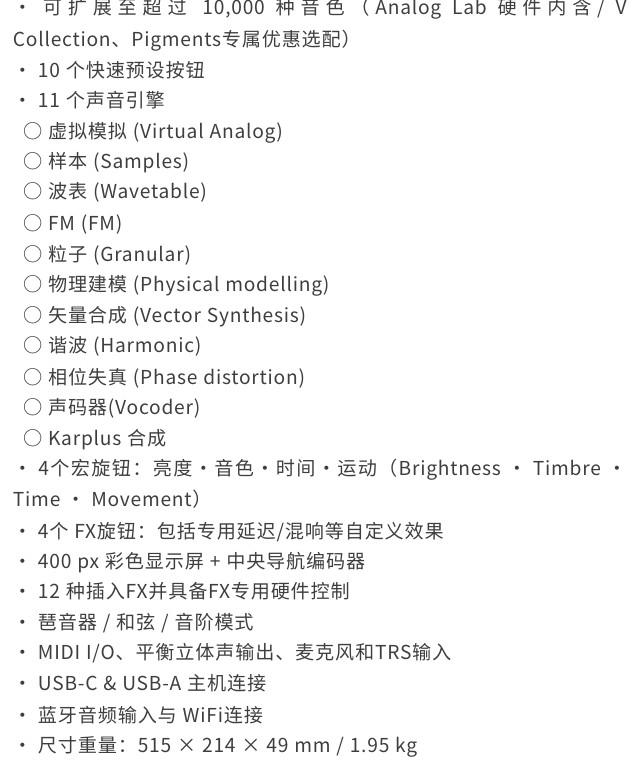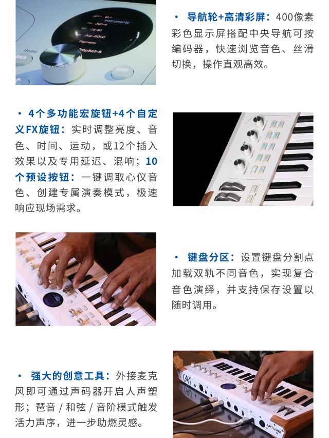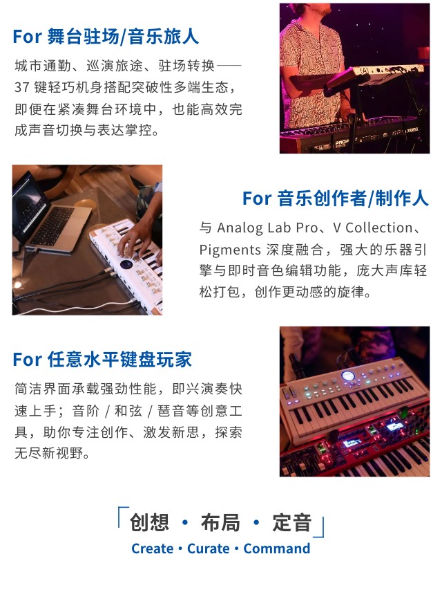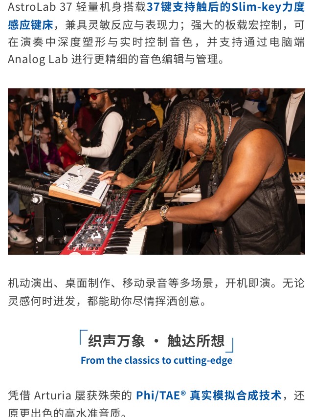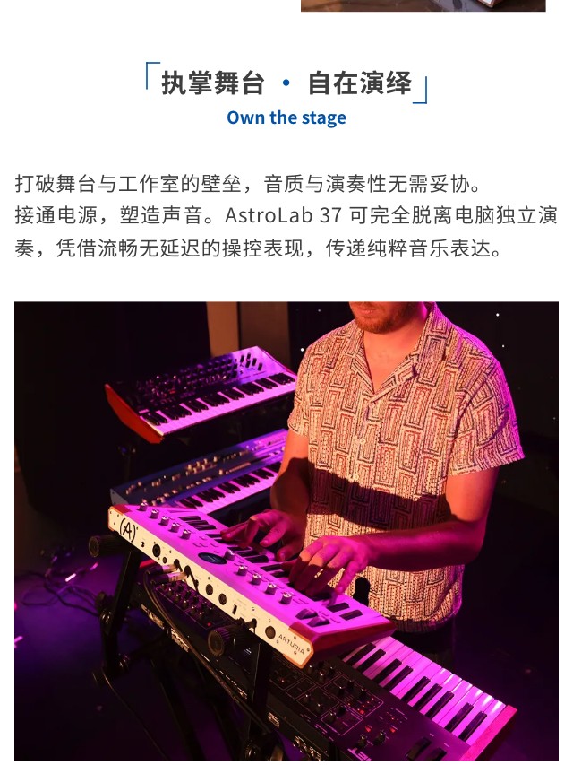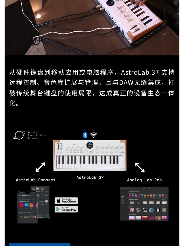 AstroLab 37是Arturia声音设计与舞台演奏领域的再次奇袭,采用37键支持触后与力度感应的Slim-key键床,以更轻盈的姿态承载完整的AstroLab声音宇宙——11种声音引擎、 44种乐器模型,1800+个精选预设,软硬件无缝协同,音色库拓展万千。以极简直观的操控布局、多端互通的生态系统,让AstroLab 37从工作室到即兴舞台穿行无间,快速部署现场,随行创作核心。