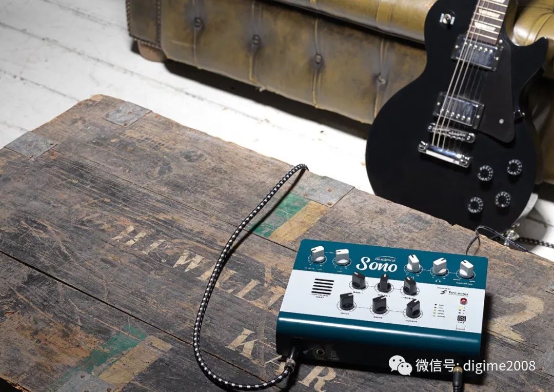 Sono 将 Audient 获奖的模拟和数字转换录音技术,跟来自 Two Notes Audio 世界上领先的音箱建模技术做了结合。Sono 内置有一颗 12AX7 模拟电子管和3段音色控制,还有 Two Notes 的 Torpedo 电路建模和音箱建模技术,可以为吉他手提供无限的音色。