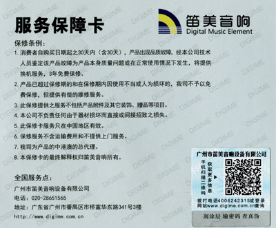 2)为了让用户更好的识别所购的LINE6产品是否为正品,所有由笛美音响代理的LINE6正品行货都贴有笛美音响服务保障卡并带有防伪查询。