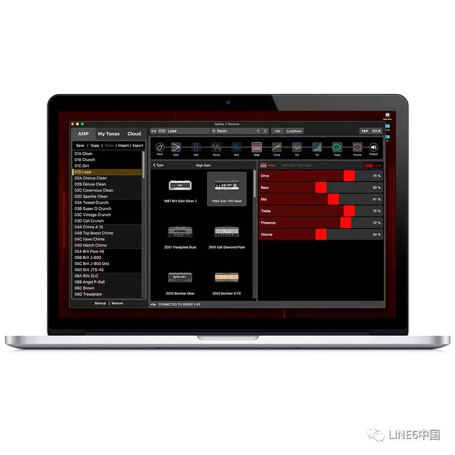 通过 Spider V MK II 音箱的 USB 端口连接到 Mac®, PC, 或移动设备上,并用免费 Spider V Remote 应用进入音箱和效果器,编辑预设,并创建与Spider V MK II 系列中所有音箱兼容的个人预设。在音色云端中还可搜索社区中所创建的预设。
