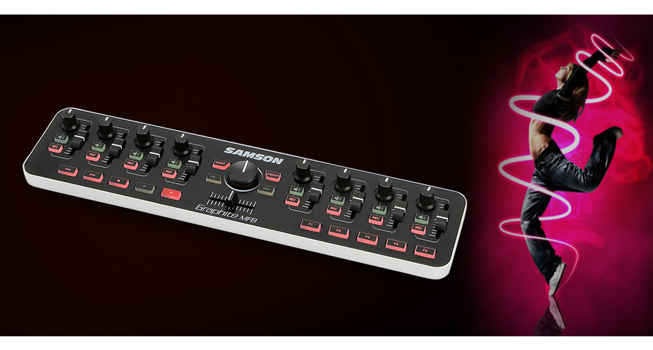 SAMSON Graphite MF8有八个通道,每个通道都有一个推子、一个记录和独奏/静音按钮。它还提供了一个主编码器、DJ风格的推杆和五个多功能按钮。它不仅可以连接iPad.还可以连接手提、台式电脑,更有免费的Graphite Editor软件下载。