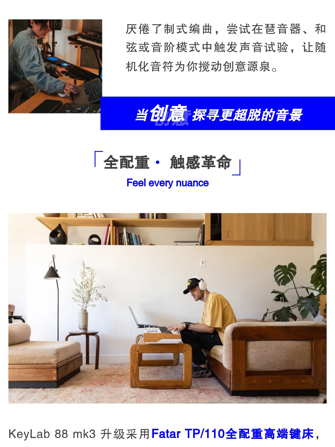 KeyLab 88 mk3,升级搭载带触后的Fatar TP/110全配重键床,捕捉指尖槌动的每一丝情感;高度兼容的DAW集成能力结合全方位进化的触感控件,掌握精密操作的每一处细节;进阶创意功能点燃灵感火花,附赠超值软件包跃迁大师水平,无论是在工作室精心雕琢还是在舞台挥洒澎湃,尽宣主权。