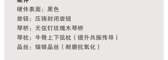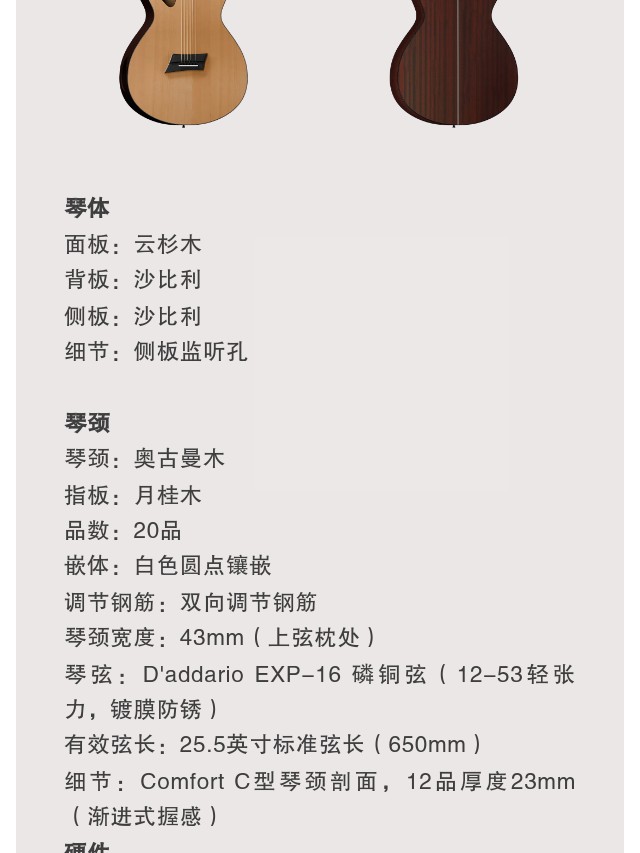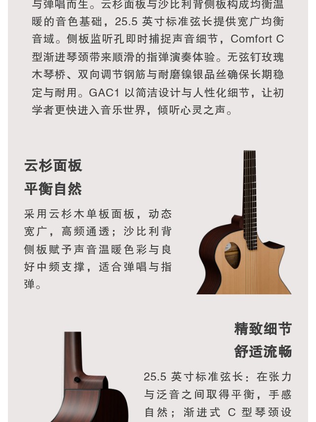 GAC1民谣吉他以舒适与实用为核心,为入门指弹与弹唱而生。云杉面板与沙比利背侧板构成均衡温暖的音色基础,25.5 英寸标准弦长提供宽广均衡音域。侧板监听孔即时捕捉声音细节,Comfort C 型渐进琴颈带来顺滑的指弹演奏体验。无弦钉玫瑰木琴桥、双向调节钢筋与耐磨镍银品丝确保长期稳定与耐用。GAC1 以简洁设计与人性化细节,让初学者更快进入音乐世界,倾听心灵之声。