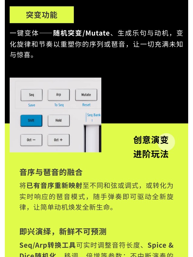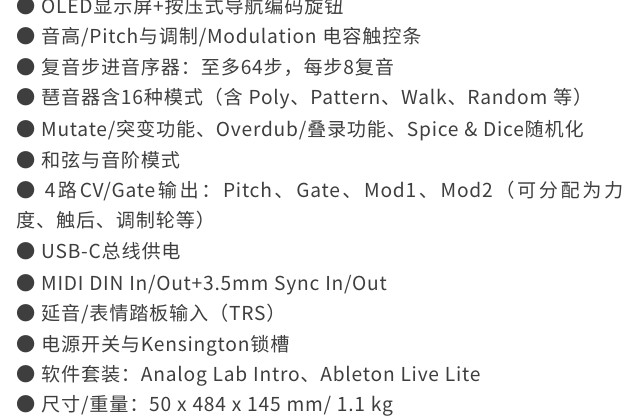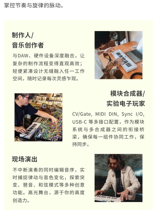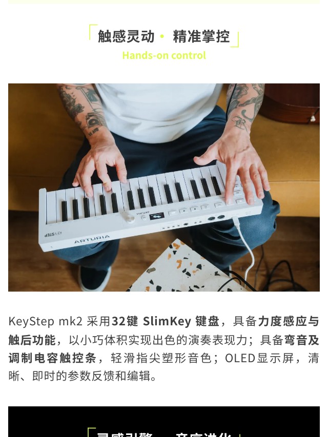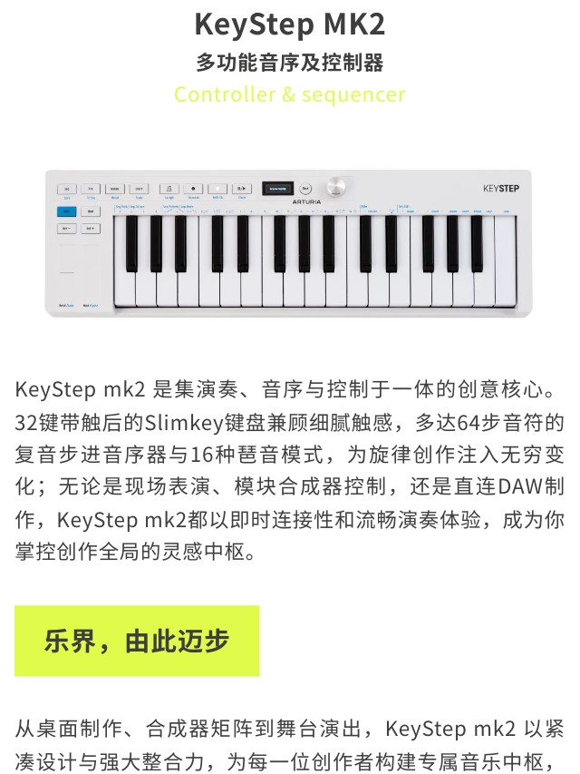 KeyStep mk2 是集演奏、音序与控制于一体的创意核心。32键带触后的Slimkey键盘兼顾细腻触感,多达64步音符的复音步进音序器与16种琶音模式,为旋律创作注入无穷变化;无论是现场表演、模块合成器控制,还是直连DAW制作,KeyStep mk2都以即时连接性和流畅演奏体验,成为你掌控创作全局的灵感中枢。