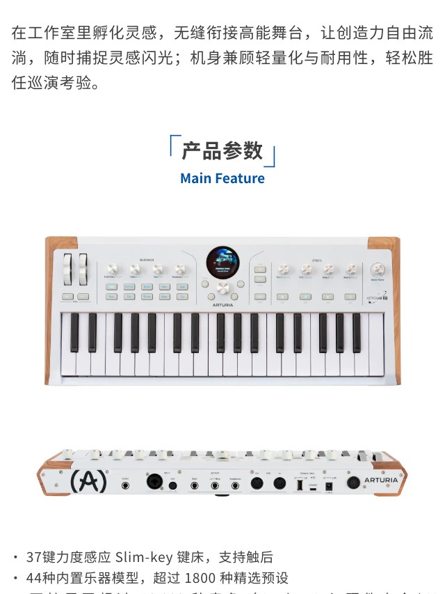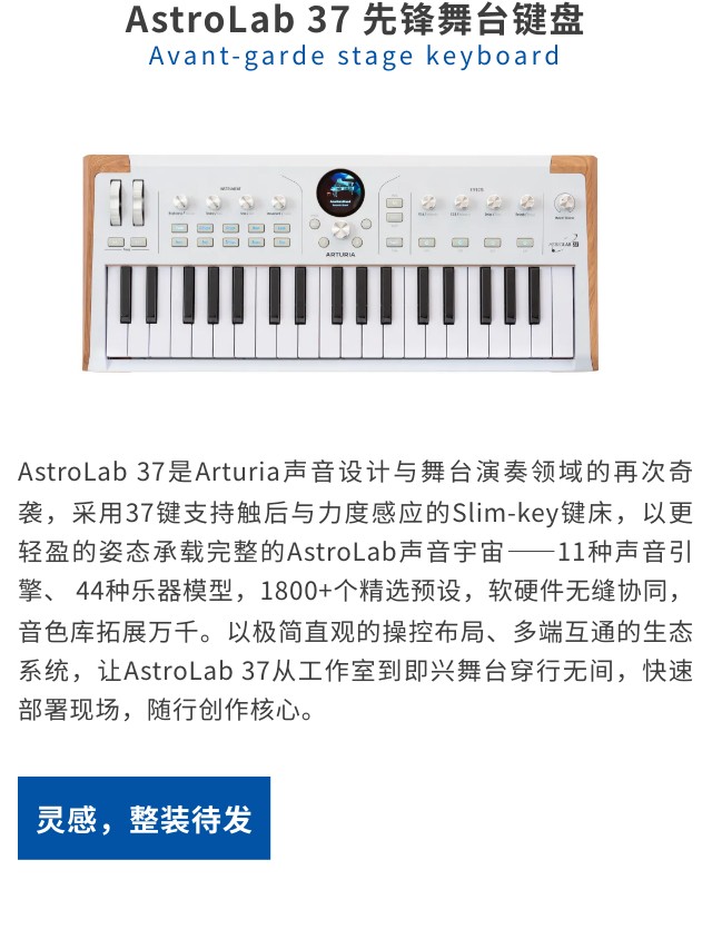 AstroLab 37是Arturia声音设计与舞台演奏领域的再次奇袭,采用37键支持触后与力度感应的Slim-key键床,以更轻盈的姿态承载完整的AstroLab声音宇宙——11种声音引擎、 44种乐器模型,1800+个精选预设,软硬件无缝协同,音色库拓展万千。以极简直观的操控布局、多端互通的生态系统,让AstroLab 37从工作室到即兴舞台穿行无间,快速部署现场,随行创作核心。