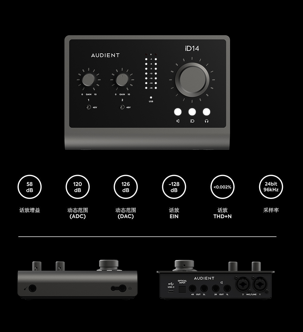而iD4和iD14这些声卡所做的事就是:把这些录音室,国际巨星级别的干净话放技术,继承到iD4和iD14这种小声卡里面。传承了艺术家对纯净音质热爱的特性。因此Audient的iD系列声卡一直都深受对音质有要求的音乐人的喜爱。著名国内音频网站:叉烧网也评测iD14后,贴切地形容iD14为:小钢炮(https://www.exound.com/articles/17028a22-b2d8-41dd-b167-68793b0b8b1c)